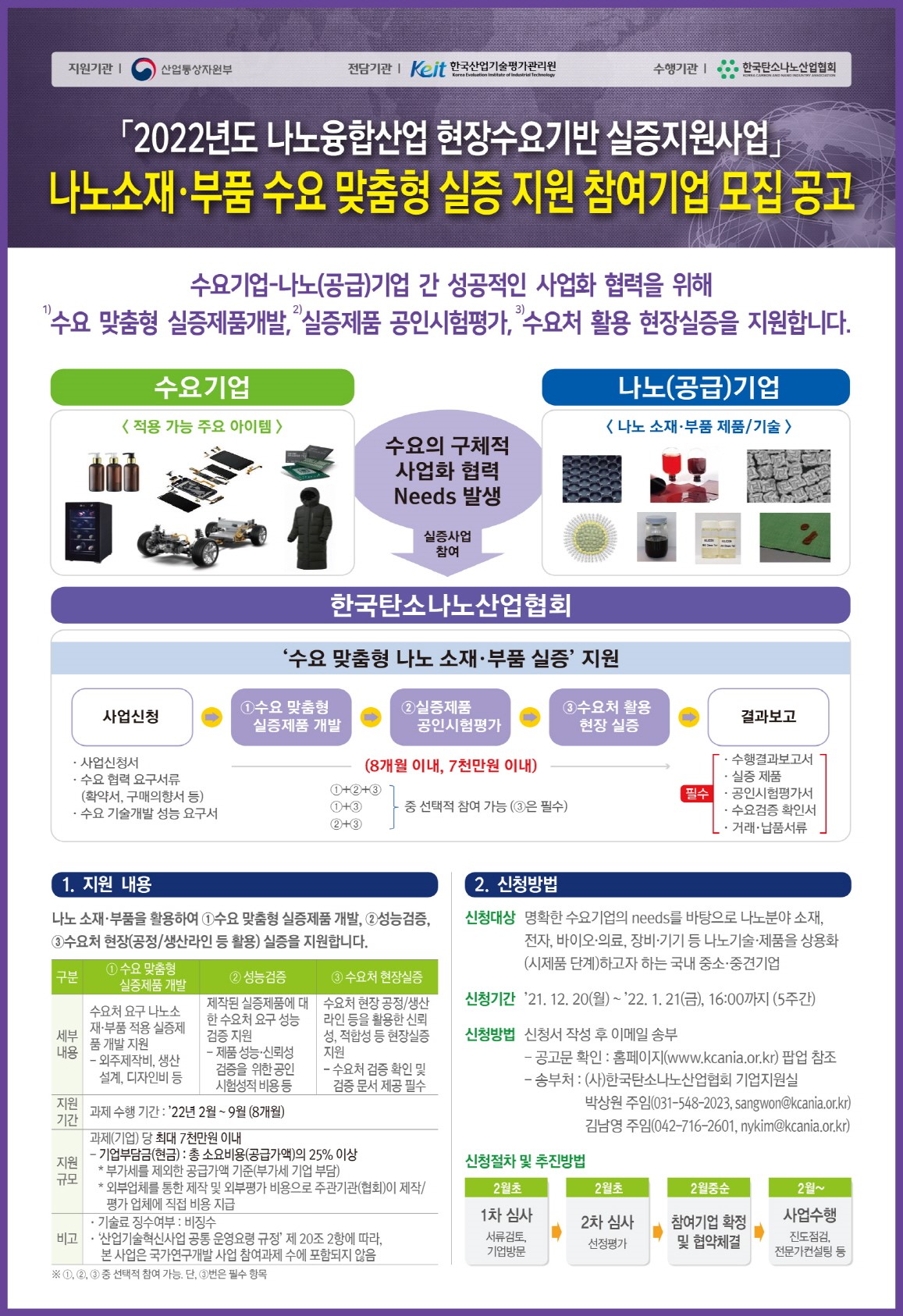등 나노기술/제품 상용화를 하고자하는 국내 중소/중견기업 ㅇ 지원내용 : 실증제품 개발 및 현장 실증에 최대 7천만원 이내 지원 ㅇ 수행기간 : '22. 2월~9월(8개월간) ㅇ 제출/문의처 - 박상원 주임(031-548-2023, sangwon@kcania.or.kr) - 김남영 주임(042-716-2601, nykim@kcania.or.kr) * 대전지역 기업