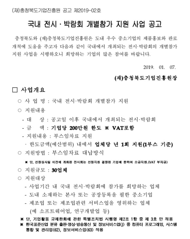 [신청마감] [충청북도기업진흥원] 2019 국내 전시·박람회 개별참가 지원 사업 공고